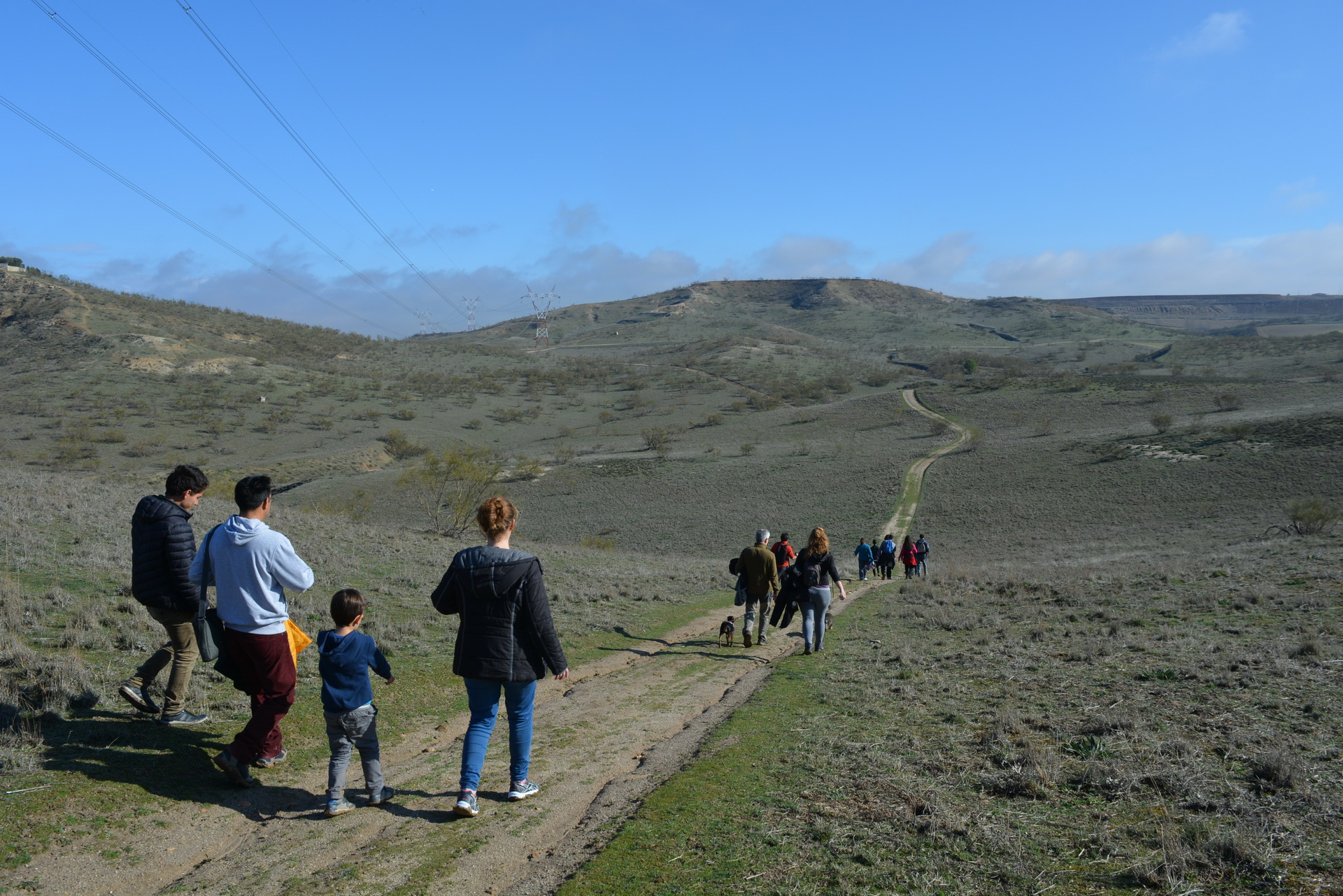Continuamos el camino hacia otra de las torretas que está situada en el cruce con el camino que viene de la Urbanización Valtibáñez hacia el Camino de la Reyerta (cruce con la Ruta Circular). Tomamos de frente el camino que asciende al Cerro de la Mesilla con una pendiente muy pronunciada. Llegamos al alto previo paso de una verja abierta y flanqueamos por la izquierda el cerro ya que es un campo de labor. Hay una senda marcada que rodea el cerro para dejarnos en un camino que viene desde la zona de la Urbanización Valtibáñez. Nos encontramos un cruce con un camino que viene desde la pista de servicio del Canal Isabel II que no tomamos, y continuamos bordeando el Cerro hacia la izquierda.